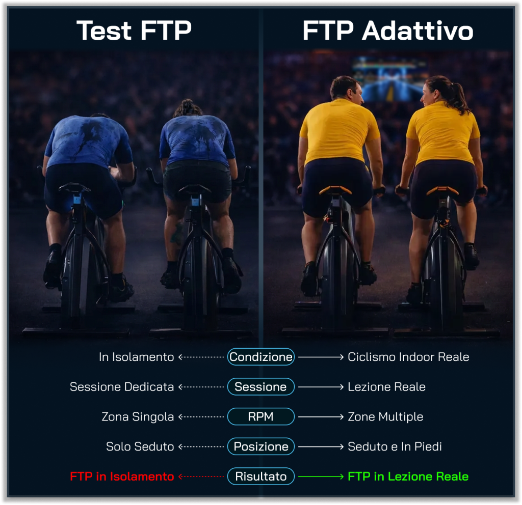 L’Adaptive FTP di CicloZone determina l’FTP durante una lezione strutturata normale – analizzando le prestazioni su più zone, intervalli di RPM e sforzi seduti e in piedi.