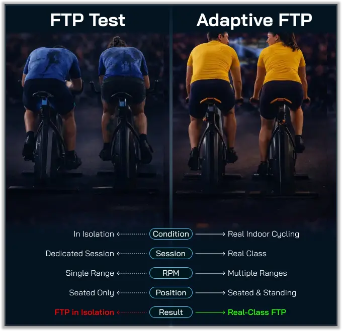 CicloZone Adaptive FTP determines FTP during a normal structured class – analysing performance across multiple zones, RPM ranges, and both seated and standing efforts.