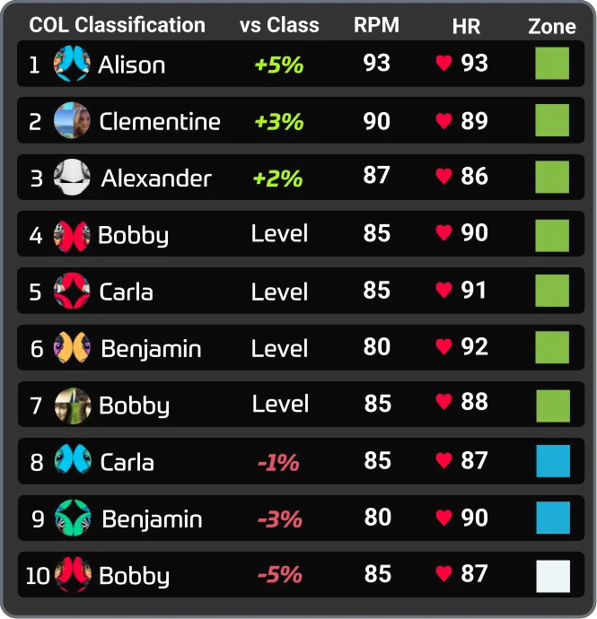 This creates meaningful feedback, fair competition, and clearly graded session difficulty – from accessible sessions to high-performance training.